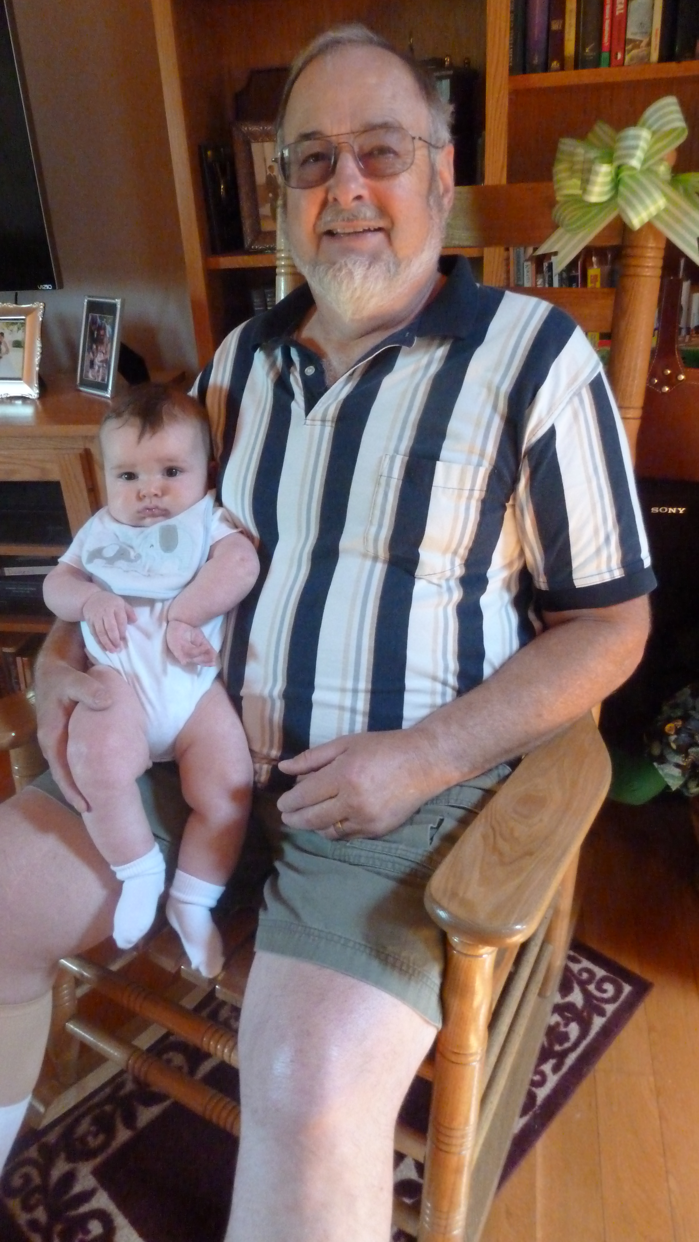 He took several of his four vacation weeks in these last months, and worked one final long week. On Friday his colleagues surprised him with a beautiful pecan rocking chair (shown above) with all their signatures on the bottom, plus a card they’d signed.