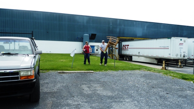 Stuart and his coworker load out the rocking chair they gave him.