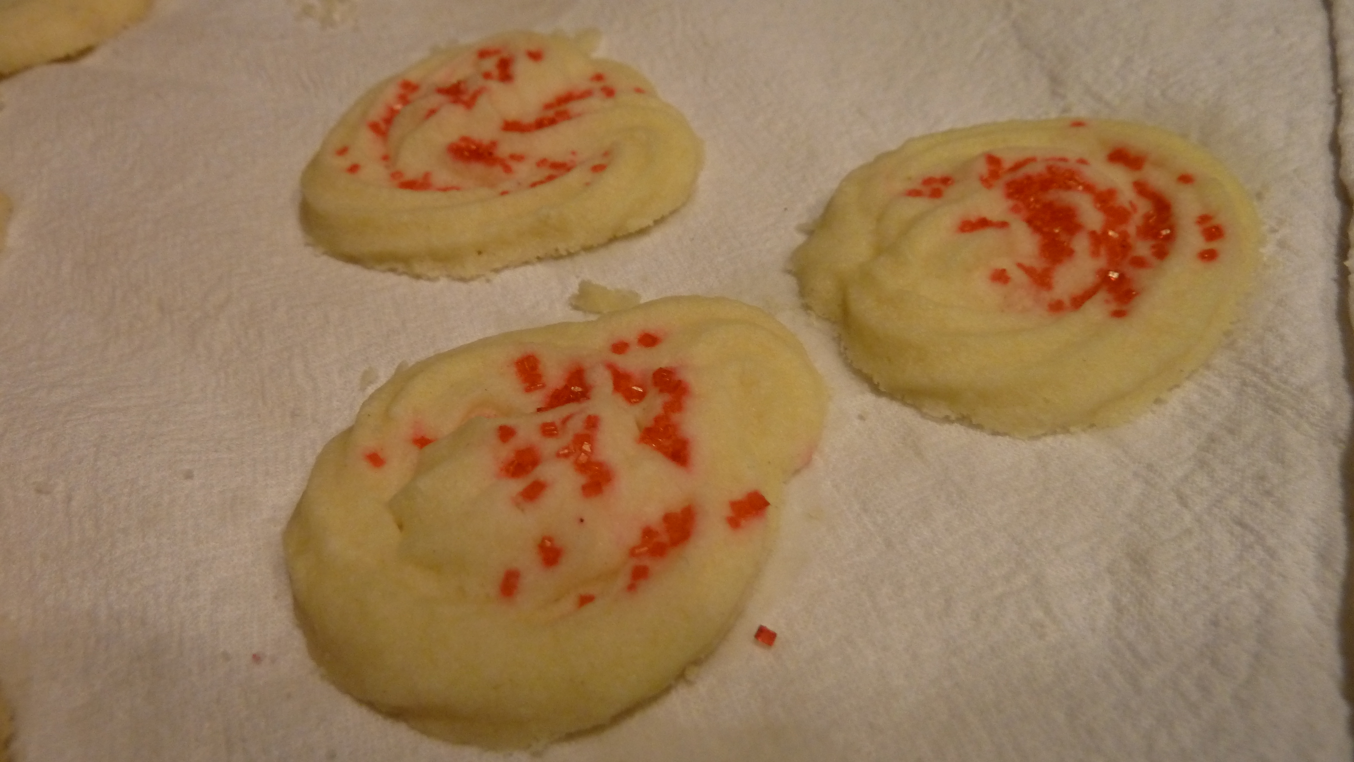 If you have a cookie press, this is a great recipe for a super easy cookie. You can still make them just dropping them by teaspoon on a cookie sheet, but to fancy them up, the cookie press is a good thing. Maybe I’ll have to put that on my Christmas list, for next time.