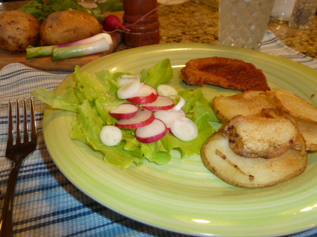My daughter’s meal: sautéed eggplant rounds (egg and flour breading), with parmesan, spaghetti sauce, mozzarella, & basil sprinkled on top if desired. Better Homes and Garden’s Cookbook. Yummy even if the “presentation” could be improved. 🙂