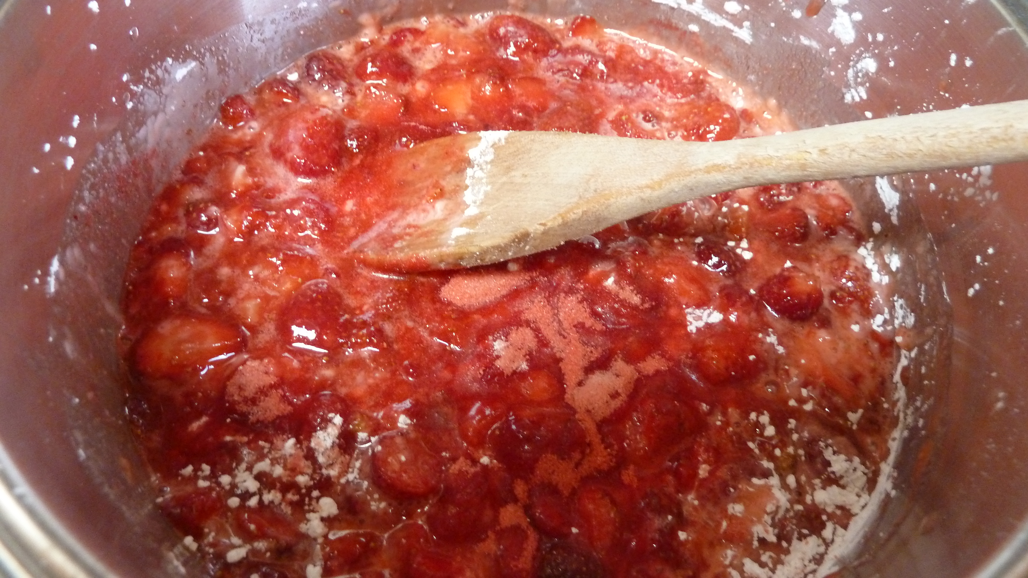 Add the second pint of whole or sliced strawberries—placing them one at a time for a prettier pie, or just add willy nilly.
